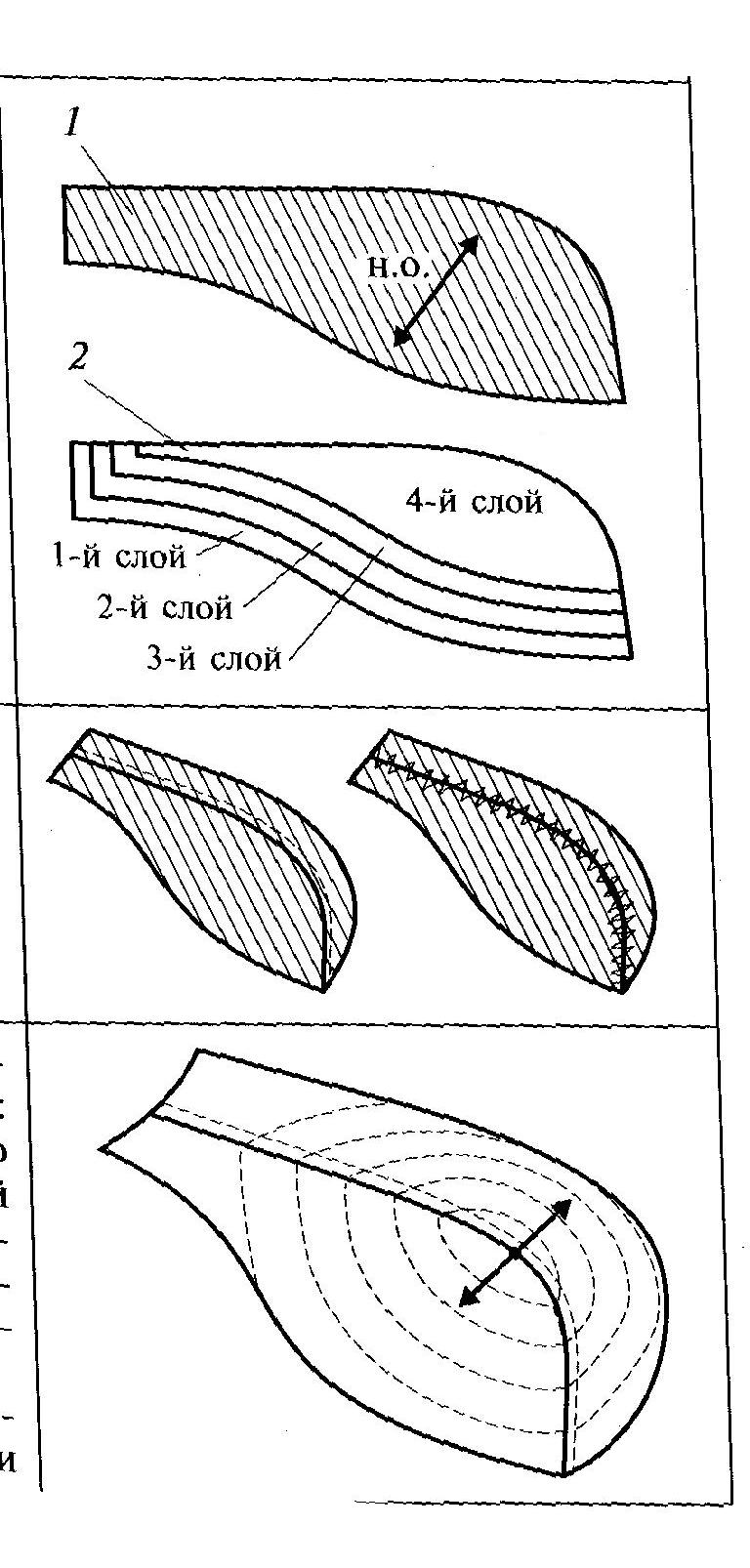 Обробка верхніх плечових накладок. Верхні плечові накладки виготовляються різної форми в залежності від конструкції рукава. Їх використовують для утворення відповідної форми плечової ділянки. Обробка плечових накладок для вшивних рукавів. Між двома викроєними деталями накладок з бортової тканини або нетканого матеріалу настилають декілька шарів ватину, вати, або синтепону, зводячи товщину настилу до овальних країв нанівець (рис. 2а). Накладки вистьобують паралельно овальному краю з інтервалом в 1 см на машині зигзагоподібної строчки або на зшивній при послабленому на тяжінні ниток. Якщо необхідно збільшити товщину накладки на ділянці пройм, шар вати або ватину збільшують і вистьобують ручним способом. Пресові накладки пресують на спеціальному пресі або припрасовують праскою, надаючи їм ввігнутої форми (рис. 2б). Щоб запобігти проявлення строчок з лиця виробу, до накладок з боку спинки приклеюють клейовою павутинкою або прямими стібками додатковий шар м’якої тканини або нетканий матеріал. Для підвищення якості і зниження трудомісткості виготовлення верхніх плечових накладок проектується випуск спеціальної голкопробивної машини для вистьобування плечових накладок. Обробка плечових накладок для рукавів покрою реглан та суцільно кроєних рукавів. Для однієї накладки необхідно6 чотири деталі з льняної тканини (або нетканого матеріалу); декілька шарів (кожен шар викроюється зі зменшенням розмірів кожного шару на 1 см) із синтепону по дві деталі кожного розміру (рис. 3а).