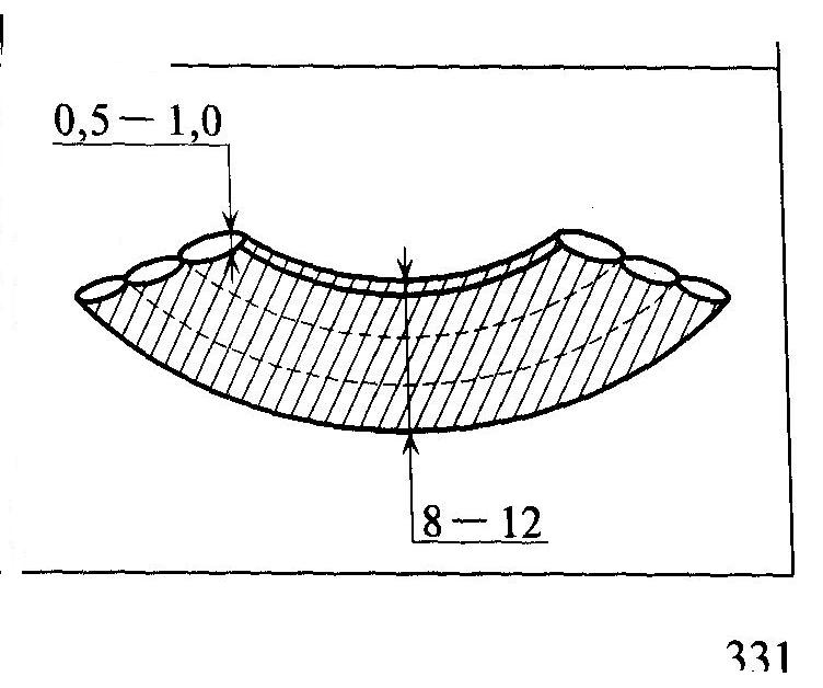 Накладки горловини. Викроюють по формі горловини спинки: ширина 8-12 см; товщина 0,5-1,01 см (до овального зрізу зводять внівець). Обробляються так само як і задні плечові накладки (накладки спинки, рис. 4б). Накладки для ділянки грудей (рис. 4в). Викроюють по формі еліпса: товщина накладок залежить від фігури замовника: товщина накладок залежить від фігури замовника. Може складатися з декількох (або одного) шарів утеплюю чого матеріалу зі зменшенням товщини країв. Виготовлять по принципу виготовлення задньої плечової накладки. Розміри накладки 16-18 см – по більшій довжині еліпсу і 10-12 – по менший довжині еліпсу. Підкроювання підокатників з ватину. Підокатники сприяють плавному переходу від плечової ділянки до вшивного рукаву. Наявність і товщина підокатників залежить від форми плеча і окату рукаву. Виготовляють також саме як ізадні плечові накладки. Викроюють підокатники по верхній частині від переднього перекату до ліктьового шву.