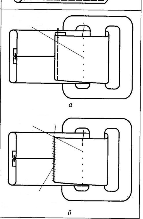 Рисунок 3 – З’єднання поясу з пряжкою Пояса, що застьобуються на пряжку, обробляються наступним чином. На вільний кінець надягають пряжку, перегинають кінець на 3-4 см на внутрішню сторону і застрочують (рис. 3а). Другу строчку прокладають спушними стібками біля перемички пряжки. В виробах з тонких тканин з підвищеною сипкістю кінець поясу підшивають потайними стібками (рис. 3б). Вільний кінець поясу буде підтримуватися шльовкою. Шльовки обробляють різними способами. Широкі шльовки з’єднуються з двох деталей – шльонки і підкладки шльонки, їх поздовжні сторони обробляються обшивним швом (рис. 4а). Вузькі шльонки обробляються на зшивній машині або краєобметувальній (рис. 4б,в,г,д).