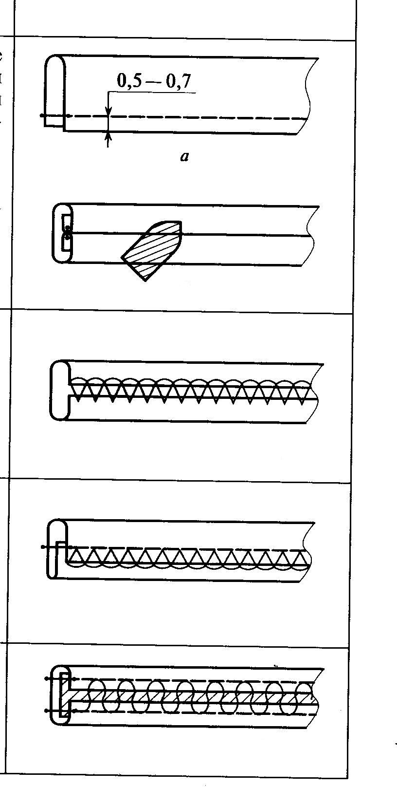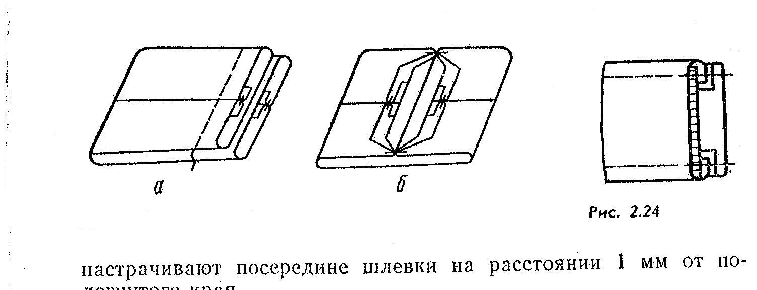 а г д Рисунок 4 – Обробка шльовок Шльовки можна обробляти на краєобметувальній машині. ЇЇ складають виворотом у середину і зрізи обметують на краєобметувальній машині з послабленням натягування так, щоб після розкладання припусків швів, зрізи розташувалися у стик (рис. 4в). Вузькі шльовки можуть оброблятися швом у підгин з відкритим обметаним зрізом (рис. 4г). Один зріз обметують, необметаний зріз ховають, склавши шльонку виворотом у середину і закріплюють зрізи машинною строчкою. Сучасне обладнання дозволяє обробляти шльонки якісно і без зайвих операцій. Зрізи запрасовують уклавши їх у стик, якщо необхідно можна підкласти прокладку і на спеціальній двоголовій машині прокладають строчку з лиця. З лиця проходить дві паралельні строчки, з другої сторони відкриті зрізи ховаються під переплетення ниток строчки (рис. 4д).