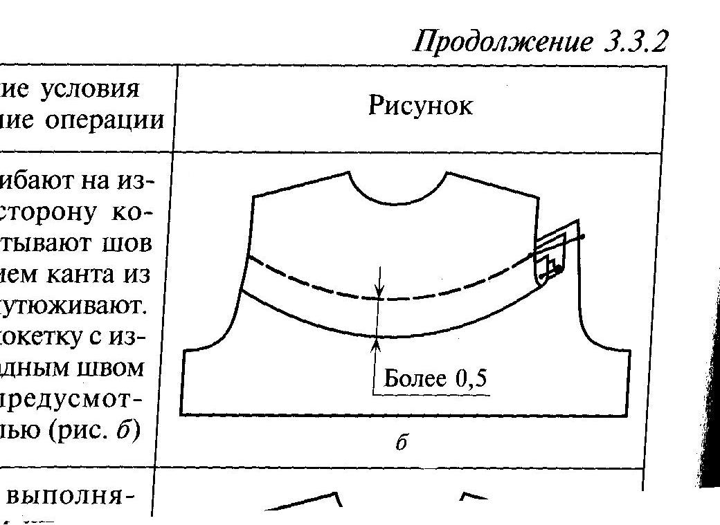 а Рисунок 2 – Обробка кокеток овальної форми. Кокетку викроєну в косому напрямку, обробляють з прокладкою, яку прокладають по кокетці по формі кокетки. Нитка основи в прокладки проходить вздовж деталі. В кокетках з кутами попередньо обробляють кути. В виступаючих кутах кокетки тканину вирізають, залишаючи припуск на зшивання, краї зрізів зшивають, шов розпрасовують.(рис. 3б). В виробах з товстих матеріалів зрізи зшивають швом у стик.
