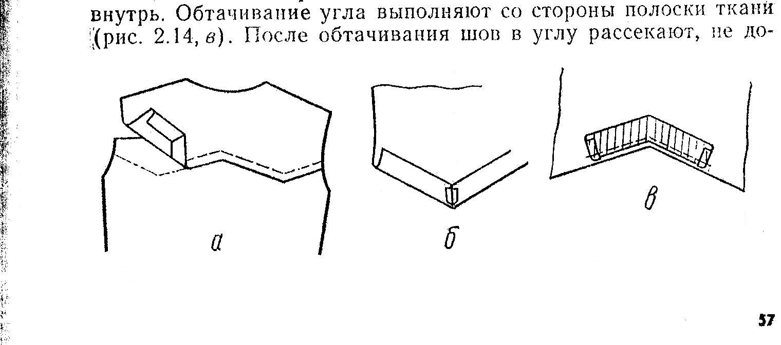 Рисунок 3 – Обробка кокеток з кутами Внутрішні кути кокетки для забезпечення їх міцності обшивають смужкою тканини, яку викроюють по формі кута. Смужку в залежності від товщини тканини верху викроюютьз основного або з бавовняного матеріалу. При обшиванні кута смужку розташовують с лицьової сторони кокетки так, щов шов обшивання кута проходив по наміченій ліні краю кокетки. Бічні сторони смужки тканини підгинають у середину. Обшивання кута виконують з боку смужки тканини (рис.3в). Після обшивання шов в куті розсікають, не доходячи до строчки на 1 мм. Обшитий кут виметують при одночасному заметуванні краю кокетки і припрасовують. Після обробки нижнього краю кокетки її наметують на основну деталь і настрочують (рис. 3а). В плащах кути кокеток попередньо не обшивають, зрізи підгинають, заклавши складку в кутах. Відлітні кокетки обробляють без підкладки або на підкладці. В відлітних кокетках без підкладки (рис. 4а) спочатку застрочують нижні краї швом у підгин з відкритим зрізом або закритим зрізом з попереднім заметуванням. Величина підгину залежить від величини оздоблювальної строчки. В кокетках, де нижній край має складну конфігурацію, його обшивають обшивкою з основного матеріалу, викроєної по формі краю кокетки.
