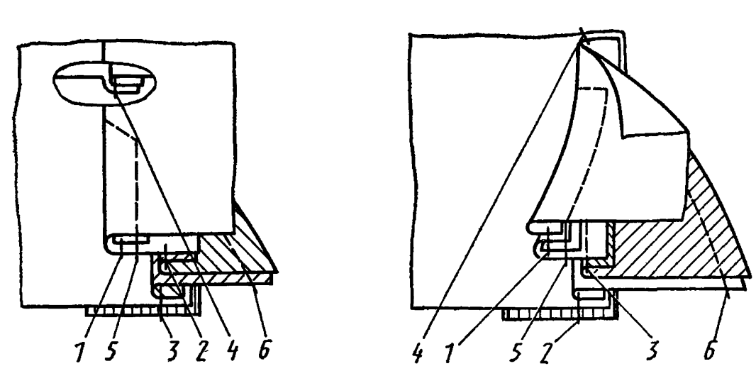 2 Обробка кишень в швах з фігурним входом При відсутності припусків з боку передньої і бічної частин пілочки або при фігурній формі шву з’єднання пілочок краї по лінії входу в кишеню обробляють за допомогою обшивок з основної тканини. Нижню обшивку викроюють широкою; вона замінює підзор, а інколи і другу частину підкладки кишені. Верхню частину пілочки обробляють обшивкою з одночасним прокладанням пружка (строчка 1). Потім до обшивки і до нижньої частини пілочки пришивають (строчка 2 і 3) частини підкладки кишені. Деталі пілочки зшивають (строчка 4), прокладають оздоблювальну строчку 5, попередньо виметавши краї входу до кишені і припрасуваши край кишені. На прикінці зшивають строчкою 6 підкладку кишені.