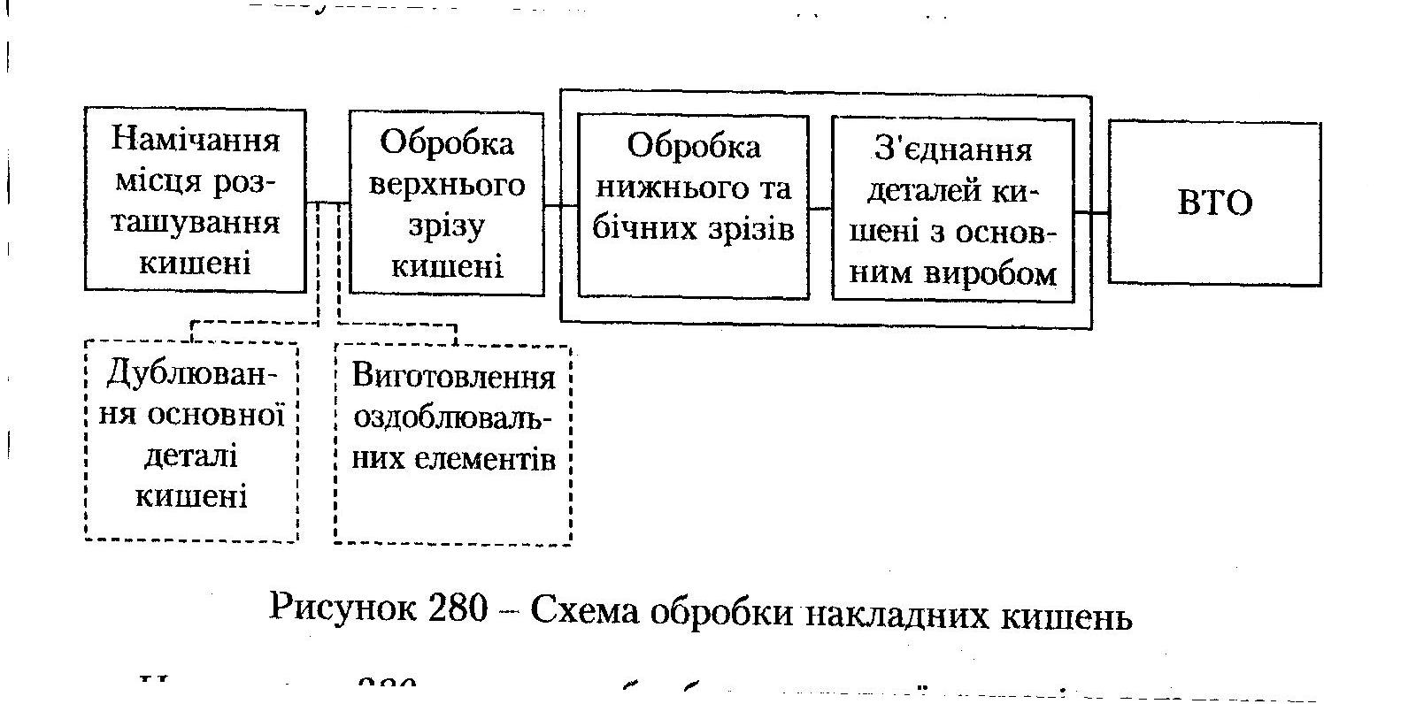 Накладні кишені різняться засобами формування входу в кишеню, формою, видами оздоблення та способом з’єднання кишені з виробом (різновид накладних кишень наведено на рисунку 2). Загальна схема накладних кишень приведена на рисунку 3. На схемі обробки накладних кишень (рис. 3) подвійною лінію показані операції, які можна виконати на напівавтоматі, пунктирною лінією – операції, виконання яких залежить від моделі та прийнятої технології обробки. Обробка накладних кишень включає виконання оздоблювальних елементів, оформлення верхніх, бічних та нижніх зрізів. Вхід у кишеню частіше розташовується зверху, тому необхідно докладніше розглянути варіанти обробки верхнього зрізу накладних кишень.