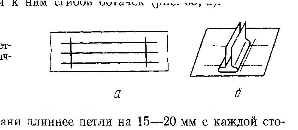 Петля в рамку з однією обшивкою. Місця розташування петель намічають під час обкрейдування пілочок. Додатково від лінії петлі в обидва краї на відстані від неї, що дорівнюється ширині двох рамок канту, наносять допоміжні лінії для прикладання до них згинів обшивок (рис. 6а).