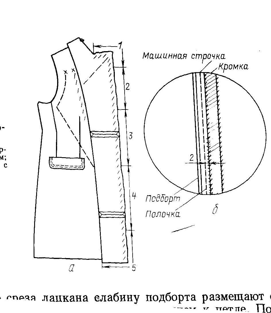 2 Обробка внутрішньої застібки Обробка бортів з внутрішньою застібкою пов’язана з рядом додаткових операцій по оформленню краю борту на ділянці застібки. Існує два варіанти обробки потайної застібки: перший з додатковим входом по краю борту (рис. 2а); другий – з додатковим входом для петель в вигляді довгої поздовжньої петлі (рис. 2б). Обробка потайної застібки з додатковим входом по краю борту. Борт і підборта на ділянці застібки обшивають (строчка 1 і 2) смужкою підкладочної тканини (обробку підборту див. в темі «Обробка підбортів»). При обробці борта в чистий край шов обшивання борта закріплюють строчкою 3. Потім обшивають верхню і нижню частини борта підбортом, суміщаючи оброблені краї борту і підборту. Підборт прикріплюють до пілочки між петлями та в кінцях застібки ручними закріпками 4. Обшивки підборта і пілочки приметують до внутрішнього краю. При відсутності оздоблювальної строчки, що закріплює внутрішній край застібки, бортову прокладку по лінії застібки прикріплюють до пілочок вручну, а зрізи обшивок з’єднують на універсальній машині строчкою 5 і підшивають до бортової прокладки на спеціальній машині потайного стібка строчкою 6.