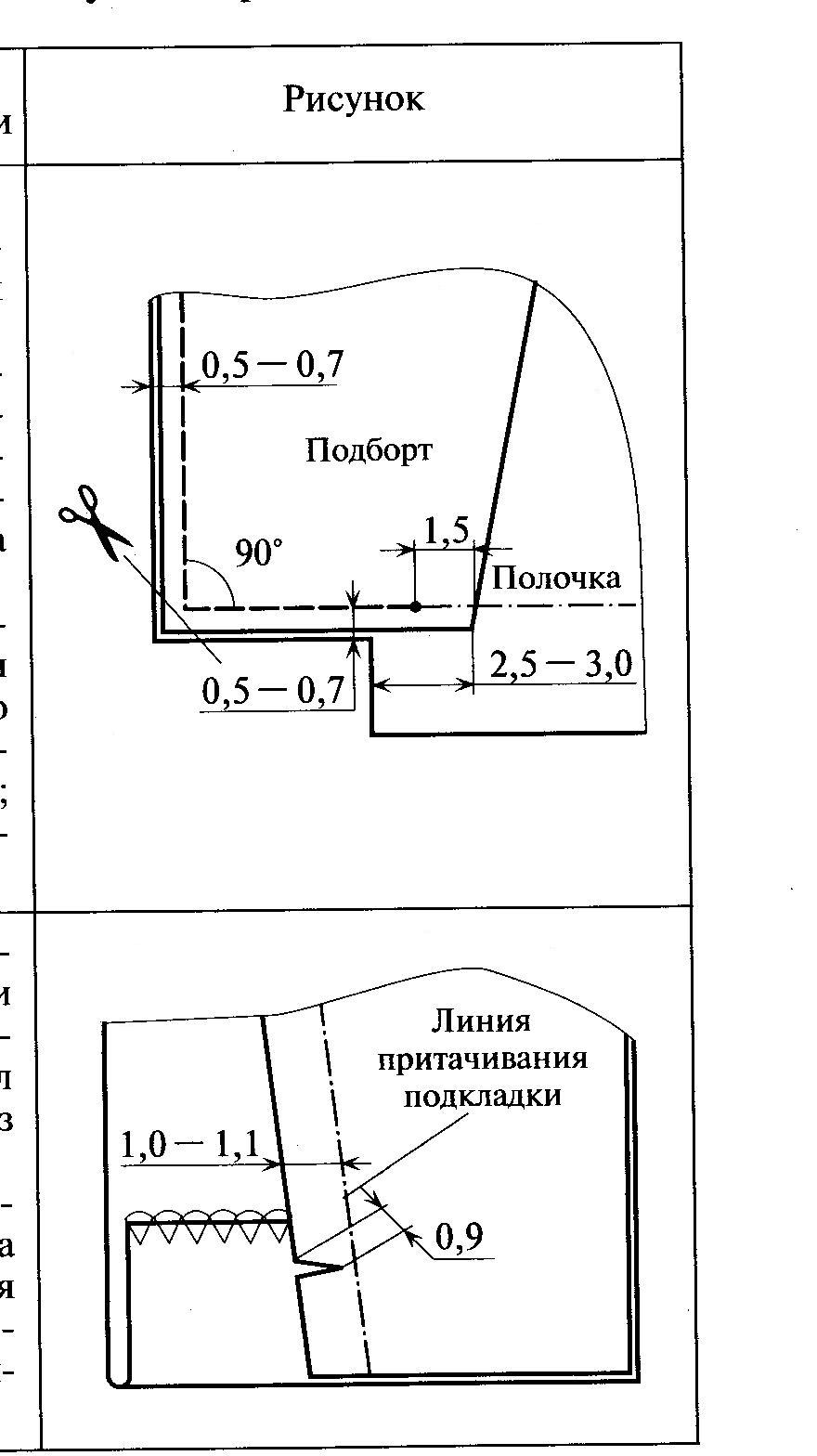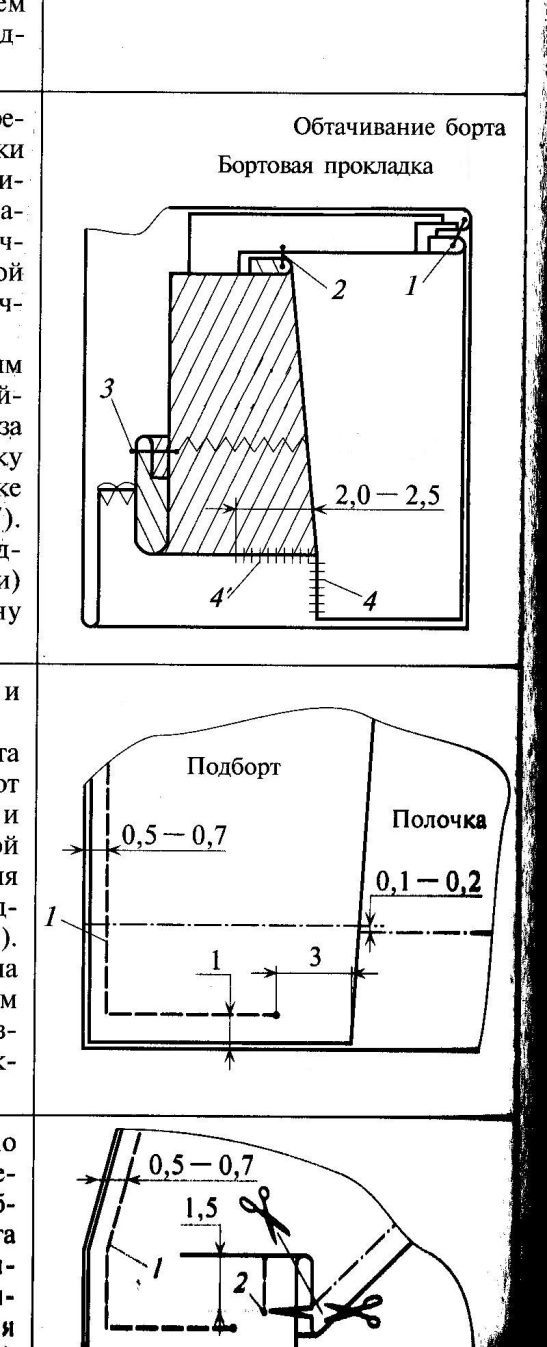 План: 1 Обробка бортів з суцільнокроєними підбортами. 2 Обробка внутрішньої застібки. 1 Обробка бортів з суцільнокроєними підбортами Наявність в виробах суцільнокроєних підбортів покращує якість обробки борту і скорочує час і трудові витрати на виготовлення виробів. Такі пілочки спресовують на ділянці грудей тільки з боку пройми і горловини. Після ВТО пілочок на них намічають лінію борту в готовому виді і уступ борта. Якщо необхідно підрізають бортову прокладку по борту для клейової кромки на 6-8 мм від лінії борту; по уступу – на 11-12 мм; для не клейової кромки по борту – 3-4 мм; по уступу – 9-10 мм. Прокладають кромку по загальним правилам на відстані 1-2 мм від лінії борту в готовому виді (рис. 1)
