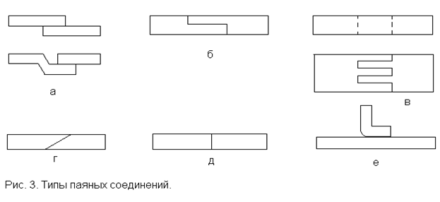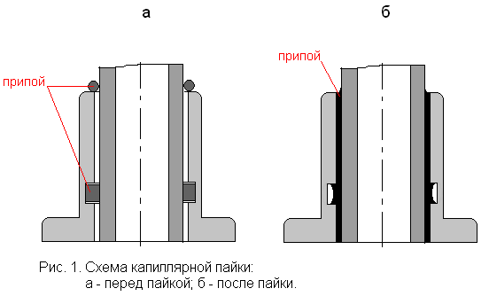 Пайка 1. Физическая сущность процесса пайки. Пайкой называется технологический процесс соединения металлических за- готовок без их расплавления посредством введения между ними расплавленного промежуточного металла-припоя. Припой имеет температуру плавления более низкую, чем температура соединяемых металлов, и заполняет зазор между соединяемыми поверхностями за счет действия капиллярных сил. При охлаждении припой кристаллизуется и образует прочную связь между заготовками. В процессе пайки наряду с нагревом необходимо удаление окисных пленок с поверхности паяемых металлов. Образование соединения без расплавления кромок обеспечивает возможность распая, т. е. разъединения паяемых заготовок без нарушения исходных размеров и формы элементов конструкции. Качество паяного шва во многом зависит от прочности связи припоя с металлом основы. В результате смачивания твердой металлической поверхности между припоем и основным металлом возникает межатомная связь. Эта связь может образоваться при растворении металла основы в расплавленом припое с образованием жидкого раствора, распадающегося при последующей кристаллизации; за счет диффузии составляющих припой элементов в основной твердый металл с образованием твердого раствора; за счет реактивной диффузии между припоем и основным металлом с образованием на границе интерметаллических соединений; за счет бездиффузионной связи в результате межатомного взоимодействия. Получение паяного соединения состоит из нескольких этапов: А) Предварительная подготовка паяемых соединений; Б) Нагрев соединяемых деталей до температуры ниже температуры плавления паяемых деталей; В) Удаление окисной плёнки с поверхностей паяемых металлов с помощью флюса; Г) Введение в зазор между паяемыми деталями жидкой полоски припоя; Д) Взаимодействие между паяемыми деталями и припоем; Е) Кристаллизация жидкой формы припоя, находящейся между спаевыми деталями; Пайкой можно соединять любые металлы и их сплавы. В качестве припоя используются чистые металлы (они плавятся при строго фиксированной температуре) и их сплавы (они плавятся в определенном интервале температур). Разница между температурами начала плавления и полного расплавления называется интервалом кристаллизации. При осуществлении процесса пайки необходимо выполнение температурного условия: t1 > t2 > t3 > t4 где t1 – температура начала плавления материала детали t2 – температура нагрева детали при пайке; t3 – температура плавления припоя; t4 – рабочая температура паянного соединения; По особенностям процесса и технологии пайку можно разделить на капиллярную, диффузионную, контактно-реактивную, реактивно-флюсовую и пайку-сварку. Капиллярная пайка. Припой заполняет зазор между соединяемыми поверхностями и удерживается в нем за счет капиллярных сил. На рис.1 показана схема образования шва. Соединение образуется за счет растворения основы в жидком припое и последующей кристаллизации раствора. Капиллярную пайку используют в тех случаях, когда применяют соединение внахлестку. Однако капиллярное явление присуще всем видам пайки. Диффузионная пайка. Соединение образуется за счет взаимной диффузии компонентов припоя и паяемых материалов, причем возможно образование в шве твердого раствора или тугоплавких интерметаллов. Для диффузионной 