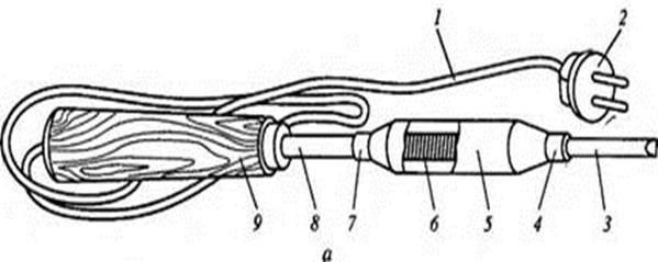 а.-угловой б.- прямой Паяльники непрерывного нагрева газовые и бензиновые обеспечивают постоянный подогрев рабочей части паяльника соответственно газовой или бензиновой горелкой. У газового паяльника (рис. 5.4, а) ацетилен и кислород подаются через штуцеры 7 и 8, закрепленные в рукоятке 6. Поступление ацетилена и кислорода к горелке 4 регулируется кранами 5 и 9. Выходящая из сопла 10 газовая смесь поджигается, обеспечивая нагрев рабочей части 1 паяльника, который соединен с горелкой хомутиком 3. В бензиновом паяльнике (рис. 5.4, б) рабочая часть 1 паяльника непрерывно подогревается бензиновой горелкой 11, в рукоятке - резервуаре 12 которой расположена емкость для бензина. Подготовка к работе таких паяльников аналогична паяльникам периодиче ского действия. Рис.5.5. Электрический паяльник: а – прямой; 1 – электрический шнур; 2 – электрическая вилка; 3 – рабочая част ь; 4,7- хомутики; 5 – кожух; 6 – нагревательный элемент; 8 – стержен ь; 9 – рукоятка; 6 –угловой; Лужение Лужением называется процесс покрытия поверхностей изделий тонким слоем расплавленного олова или сплава олова со свинцом.