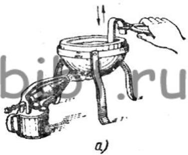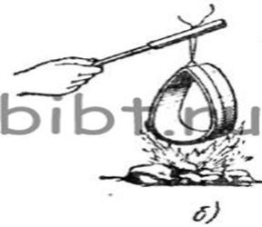 Изделие нагревается медленно и равномерно на древесном угле (рис. 179, б) до температуры 225-250°, затем на нагретую поверхность насыпают припой и, после того как он начнет плавиться, его быстро растирают щеткой или чистой холщовой тряпкой (рис. 179, в) по всей поверхности, удаляя излишний слой полуды.