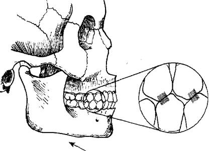 Рис. 3.32. Задние ретрузивные контакты могут происходить между мезиальными скатами верхних зубов и дистальными скатами нижних зубов. Резюме Когда два противолежащих задних зуба смыкаются обычным способом (например, верхние язычные бугры контактируют с противолежащими центральными ямками или нижние щечные бугры контактируют с противолежащими центральными ямками), потенциальные контактные области во время любого экцентрического движения нижней челюсти находятся в предсказуемой области поверхности зуба. Каждый скат опорного бугра потенциально может создать экцентрический контакт с противолежащим зубом. Внутренний скат неопорного бугра может также контактировать с противолежащим зубом во время экцентрического движения. На рис. 3.33 изображены окклюзионные контакты, которые могут происходить на верхнем и нижнем первых молярах. Клиницист должен помнить, что эти области являются единственными потенциальными контактными областями, потому что не все задние зубы контактируют во время движений нижней челюсти. В некоторых случаях несколько зубов контактируют во время движения нижней челюсти, что размыкает оставшиеся зубы. Однако, если зубы контактируют во время движения нижней челюсти, эта область контакта изображена на диаграмме на рис.3.33.