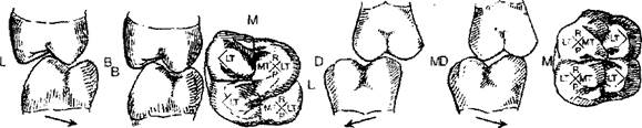 Ретрузивное движение происходит, когда нижняя челюсть движется назад из ПМО. По сравнению с другими движениями ретрузивное движение очень короткое (1-2 мм). Ретрузивное движение ограниченно связочными структурами, упомянутыми в гл.1. Во время ретрузивного движения нижние щечные бугры движутся дистально поперек окклюзионной поверхности противолежащих верхних зубов (рис.3.32). Области потенциального контакта встречаются между дистальными скатами нижних щечных бугров (опорные бугры) и мезиальными буграми противолежащих ямок и краевых гребней. На верхнечелюстной дуге ретрузивные контакты встречаются между мезиальными скатами противолежащих центральных ямок и краевых гребней. Ретрузивные контакты происходят на противолежащих скатах протрузивных контактов, поскольку движение в точности противоположное.