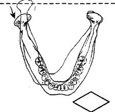 Когда нижняя челюсть находится в правой боковой пограничной позиции, сокращение правой нижней латеральной крыловидной мышцы вместе с продолжающимся сокращением левой нижней латеральной крыловидной мышцы заставит правый мыщелок двигаться вперед и влево. Поскольку левый мыщелок уже находится в своем максимальном переднем положении, движение правого мыщелка в максимальное переднее положение вызовет смещение назад по средней линии нижней челюсти до совмещения со средней линией лица (рис.4.25). Это завершает пограничное движение нижней челюсти в горизонтальной плоскости.