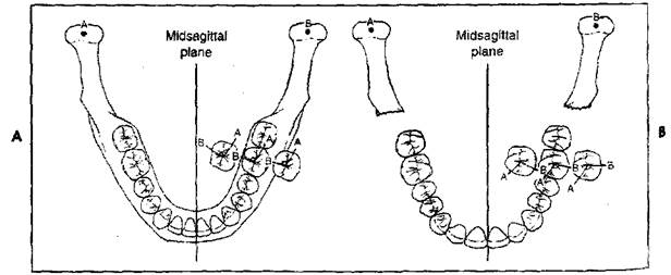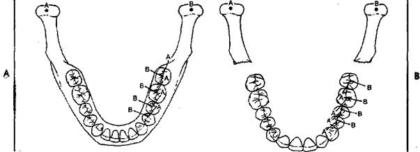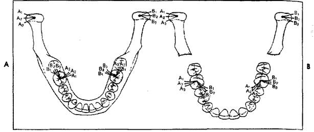 Рис.6.21. Чем больше расстояние до зуба от средне-сагитальной плоскости, тем шире угол, сформированный латеротрузивной и медиотрузивной траекторией. Это правильно как для (А) нижних, так и (В) верхних зубов. А - Медиотрузивная траектория. В - Латеротрузивная траектория. ЭФФЕКТ РАССТОЯНИЯ ОТ ВРАЩАЮЩИХСЯ МЫЩЕЛКОВ И СРЕДНЕ-САГИТАЛЬНОЙ ПЛОСКОСТИ НА НАПРАВЛЕНИЕ ГРЕБНЕЙ И БОРОЗДОК Было доказано, что положение зуба по отношению к вращающемуся мыщелку и средне-сагитальной плоскости влияет на латеротрузивную и медиотрузивную траектории. Комбинация двух позиционных отношений - это то, что определяет точные траектории вершин опорных бугров. Расположение зуба на большем расстоянии от вращающего мыщелка, но ближе к средне-сагитальной плоскости, приведет к тому, что последний фактор устранит влияние первого. Самый большой угол между латеротрузивными и медиотрузивными траекториями будет создан зубами, расположенными на зубной дуге на большом расстоянии как от отвращающегося мыщелка, так и от средне-сагитальной плоскости. Из-за кривизны зубной дуги можно видеть следующее. Когда расстояние зуба от вращающегося мыщелка возрастает, то расстояние от средне-сагитальной плоскости уменьшается. Однако, поскольку расстояние от вращающегося мыщелка возрастает быстрее, чем уменьшается расстояние от средне-сагитальной плоскоти, в целом зубы по направлению к переднему региону (премоляры) будут иметь большие углы между латеротрузивной и медиотрузивной траекториями, чем зубы, расположенные сзади (моляры) (рис.6.22).