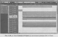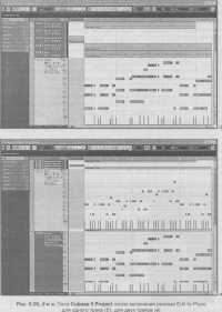 Начиная с Cubase SX 3, редактировать отпечатки клавиш можно не только в окне Key Editor, но также непосредственно в окне проекта. Такой режим редактирования называется Edit In-Place (редактирование на месте). На рис. 6.26 для сравнения представлено окно Cubase 5 Project до (рис. 6.26, a) и после (рис. 6.26, б) включения режима Edit In-Place. В режиме Edit In-Place изображение MIDI-трека подменяется изображением отпечатков клавиш, имеющихся в частях на этом треке. Для перехода в режим Edit In-Place предназначена команда главного меню MIDI > Edit In-Place. Режим включается для того трека, который выбран в списке треков (Track list, см. гл. 4) окна проекта (Cubase 5 Project), либо выделен в этом же окне. На рис. 6.26, а и 6.26, б таким треком является трек Strings. Для перехода в режим Edit In-Place (и возврата в обычный режим) можно воспользоваться кнопкой [tsj| (Edit In-Place), на рис. 6.26. а и б, на нее наведен указатель мыши.