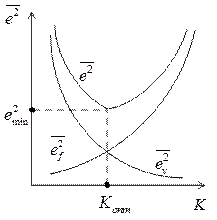 При синтезе систем со случайными воздействиями решается задача определения динамических характеристик системы, наилучшим образом обеспечивающих выполнение определённого статистического критерия оптимальности. Наиболее часто применяется критерий минимума среднеквадратичной ошибки системы. В простейшем случае, когда на систему воздействуют некоррелированные стационарные полезный сигнал Графики зависимости составляющих ошибки от коэффициента передачи разомкнутой системы (рис. 3.3) могут иметь вид, изображенный на рис. 3.5