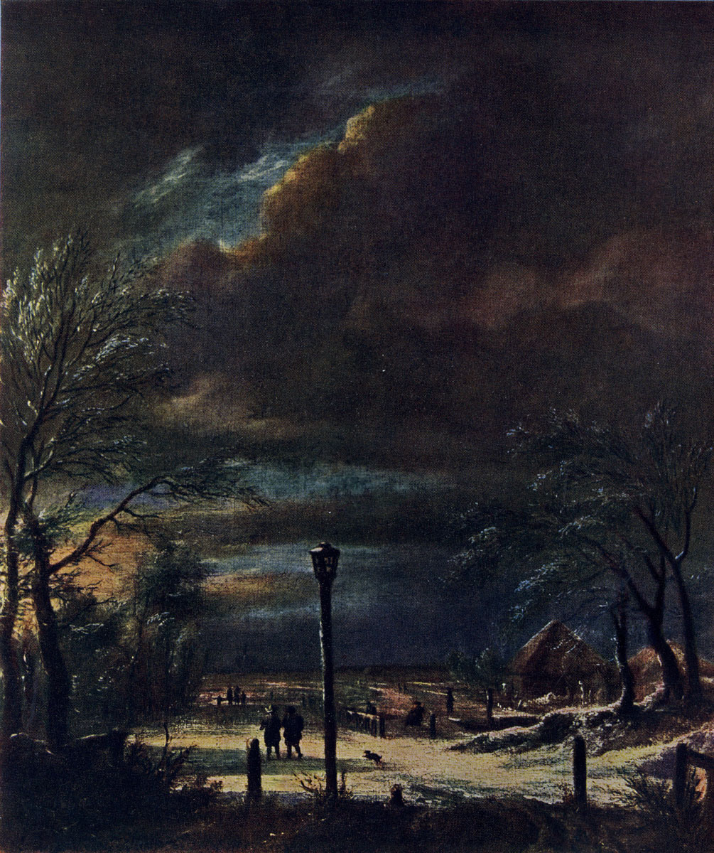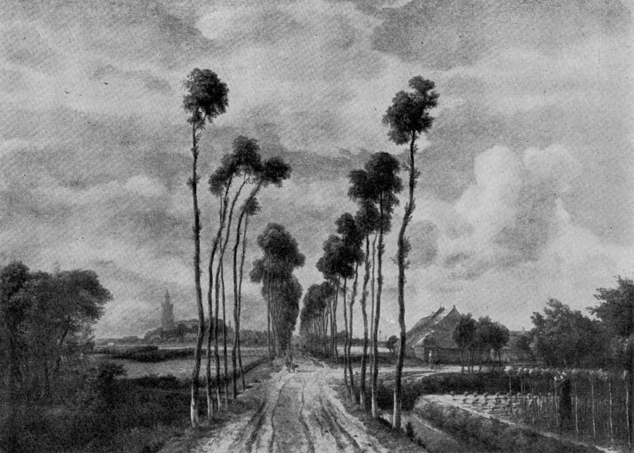 Но Рейсдалю удавались не только патетические образы; даже столь обычный для голландцев ландшафт с ветряной мельницей приобретает у него черты подлинной монументальности («Мельница на Рейне»; Амстердам, Рейксмузей), а скромный мотив дороги у опушки леса превращается в обобщенный образ природы («Пейзаж с путником»; Эрмитаж).