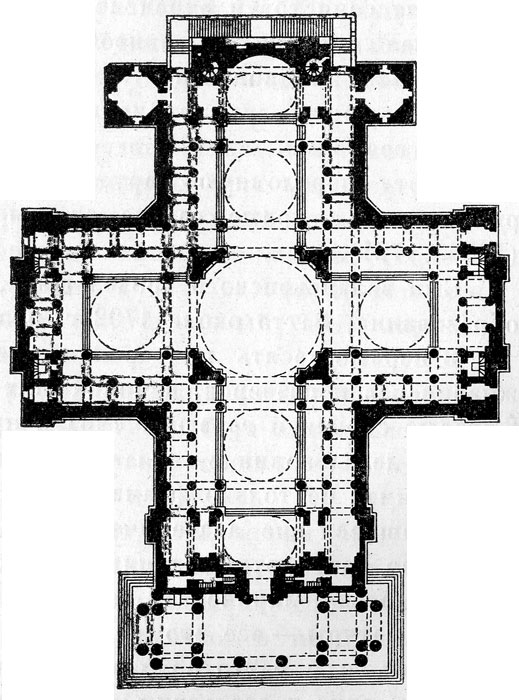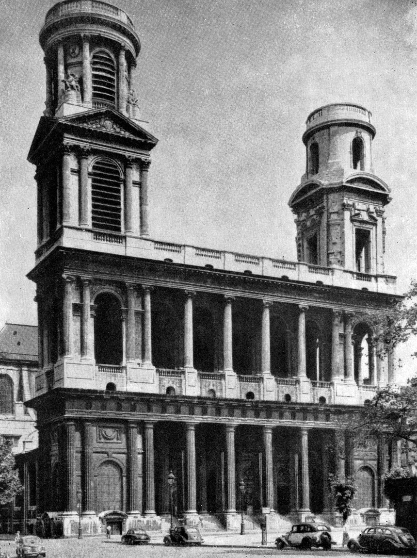 Совершенно иначе решает Бофран свои интерьеры. Блестящий тому пример— внутренний декор отеля Субиз (1735—1740). Не считаясь с внешним обликом особняка, который был выполнен Деламером в 1705—1709 гг. в классических традициях, Бофран сообщает комнатам отеля характер изящных бонбоньерок. Резные панели, лепные орнаменты, живописные панно сплошным ковром устилают стены и потолок. Эффект этих изысканно нарядных, прихотливо легких форм должен быть особенно впечатляющ по контрасту с более сдержанной архитектурой фасада. Культовое строительство в этот период имело несравненно меньшее значение, нежели светское. В основном завершались постройки предшествующего столетия. Такова церковь Сен Рош в Париже, начатая Робером де Коттом в конце 17 в. и Законченная уже после смерти этого архитектора его сыном Ж.-Р. де Коттом.