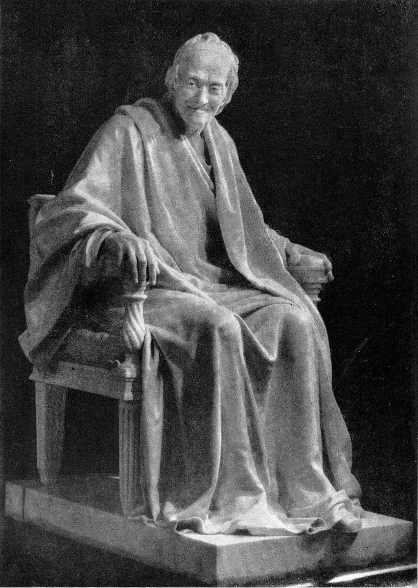 Одно из наиболее значительных произведений Гудона — может быть, вершина его творческого расцвета предреволюционных лет — статуя Вольтера (Ленинград, Эрмитаж; другой вариант — фойе Театра Французской комедии в Париже). Гудон начал работать над этим портретом в 1778 г., незадолго до смерти «фернейского патриарха», вернувшегося с триумфом в Париж. Известно, что поза и движение не сразу были найдены Гудоном — во время сеанса в быстро устающем восьмидесятичетырехлетнем старике трудно было увидеть триумфальное величие, чего ждали современники от скульптора. Воображению Гудона, которое не было сильной стороной его дарования, помог случай — живой обмен репликами, ожививший воспоминания, вновь воспламенивший ум Вольтера. Поэтому столь выразительна поза философа. Он повернулся к воображаемому собеседнику, правая рука помогает этому резкому движению — костлявые длинные пальцы вцепились в ручку кресла. Напряженность поворота ощущается и в положении ног, и в усилии торса, и даже в формах кресла — внизу желобки вертикальны, сверху будто скручиваются спиралью, передавая движение руки. В морщинистом лице Вольтера есть и внимание и сосредоточенное раздумье — брови сдвинуты к переносице. Но самое примечательное в нем — столь характерная для самой натуры Вольтера саркастическая усмешка, выражение скрытой энергии ума, готового к тому, чтобы убийственным огнем иронии блистательного полемиста сразить идейного врага. Изображение Вольтера в творчестве Гудона очень далеко от модных тогда «апофеозов». Сила его в том, что он раскрывает наиболее важные черты эпохи Просвещения, олицетворенные в характере одного из величайших ее представителей, эпохи смелой революционной мысли, беспощадной критики предрассудков. Статуя Вольтера, созданная Гудоном, может быть названа историческим портретом— в ней содержится целая эпоха. К этому Гудон шел не традиционным путем риторики и аллегории. Даже античная тога — очевидный прием классицизма — воспринимается не как атрибут древнего философа, а как обычная свободная одежда, удачно скрывающая старческую худобу и придающая монументальной статуе необходимую обобщенность формы.