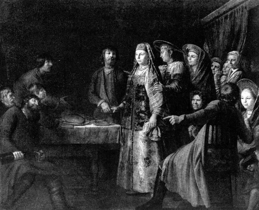 К числу наиболее значительных явлений в области русского бытового жанра Этого времени принадлежат две работы крепостного художника Михаила Шибанова. Его творческая деятельность (он работал и как портретист) развернулась в 1770-х годах. К этому времени относятся его картины «Крестьянский обед» (1774) и «Празднество свадебного договора» (1777) (обе в Третьяковской галле-рее). Все образы первой картины — и старик крестьянин, и собирающая на стол старуха, и молодой мужик, режущий хлеб, и женщина, приготовляющаяся кормить ребенка,— значительны, исполнены чувства собственного достоинства. Вместе с тем они достаточно индивидуальны: художник замечает торжественную серьезность и следы утомления в лице старика, равнодушие усталого человека в лице старухи, сдержанную нежность в позе и выражении лица молодой крестьянки с ребенком. Простота композиции, в которой опущены все ненужные подробности, сдержанность и суровость колорита картины, выдержанного в коричневых тонах, усиливают значительность образов. Реализм, духовное благородство образов присущи и «Празднеству свадебного договора», композиция которого несколько скована отзвуками академических канонов. Любовно-внимательное отношение к крестьянину и его жизни выражается здесь и в том, что художник не только передает с этнографической точностью особенности крестьянского праздничного наряда, но и стремится раскрыть его эстетическую значительность.