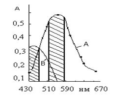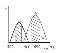 3) спектры поглощения определяемых компонентов частично накладываются друг на друга. В этом случае (рисунок 5) при фотометрировании с различными светофильтрами можно пренебречь светопоглощением одного компонента, например, при фотометрировании с использованием светофильтра «а» можно пренебречь светопоглощением компонента В и считать, что Аa(смеси)=Аa(А). При фотометрировании смеси с другим светофильтром (в), оптическая плотность смеси равна сумме оптических плотностей компонентов А и В.
