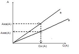 Затем измеряют оптическую плотность окрашенной смеси компонентов А и В со светофильтром «а» и по измеренному значению Ахa(A) и калибровочному графику Аa(A) = f(C(A))-кривая а на рисунке 6 сразу же находят неизвестную концентрацию Сх (А) компонента А в смеси. Далее, используя кривую «в» на рисунке 6 определяют оптическую плотность раствора компонента А со светофильтром «в» - Ав(А). После этого измеряют оптическую плотность исследуемой смеси компонентов А и В со светофильтром «в». Измеренная величина оптической плотности - суммарная