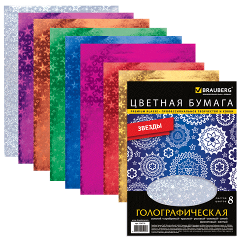 Код 124719 – «Звезды» Код 124720 - «Сердечки» Цена – 108 руб. Набор цветной бумаги со спецэффектами BRAUBERG предназначен для творчества, хобби, моделирования, оформления презентаций, как любителями, так и профессионально занимающимися людьми.