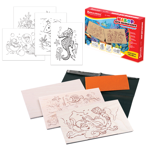 Код 150653 Цена – 251 руб. Набор для выжигания BRAUBERG дает простор для творчества: выжечь уже нанесенные на фанеры рисунки или самому нанести на чистую фанеру через прилагаемую копировальную бумагу один из 4-х предлагаемых рисунков, и, в дальнейшем, выжечь. Развивающий подарок.