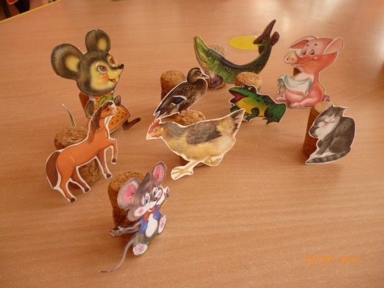 2. Сказка – «Заюшкина избушка». Герои: Лиса, заяц, собаки, медведь, петух, волк. Можно использовать пробки от шампанского, вина. (вырезать готовые картинки персонажей).