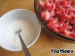 | Клубнику смешать с 1/4 стакана сахара, крахмал развести водой.
