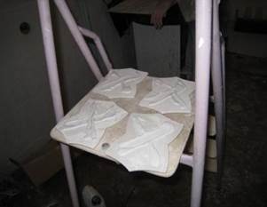 | Приготовленный раствор наносят в количестве 0,5 столовой ложки на тыльную сторону изделия по диагонали крест на крест (с угла на угол), после чего изделие прикрепляют к поверхности но 3 секунды и убирают руку (если раствор приготовлен правильно, изделие держится сразу). По истечении 8 секунд изделие сдвигать в сторону и поправлять запрещается. Приготовленный клеевой раствор можно использовать в течение 20 минут, поэтому раствор приготавливают в небольших количествах, по 0,5 л.