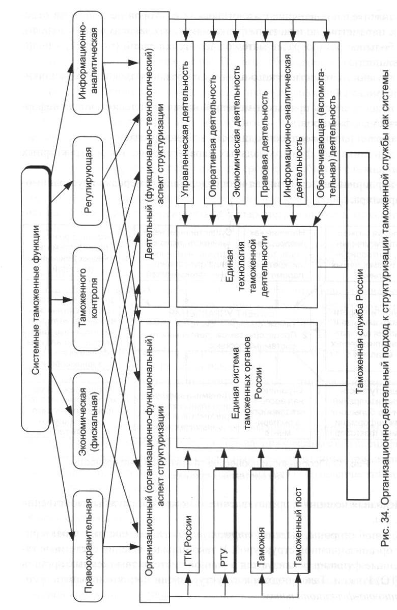 Исходная позиция в представлении таможенной службы двойственна (рис. 34). С одной стороны, выделяя структурный аспект, систему характеризуют организационной структурой. В таком представлении системные таможенные функции реализуются в единой системе таможенных органов (ЕС ТО) России. Такой подход к структуризации принято называть организационно-функциональным.