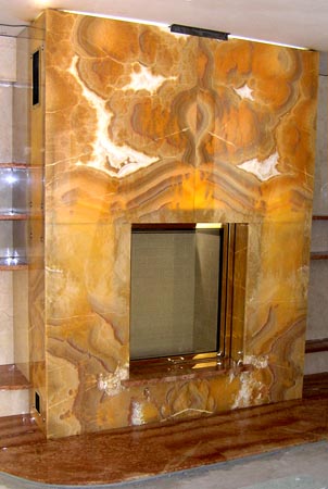 Также, часто дизайнеры и скульпторы используют оникс в облицовке каминов. В данном случае, выглядит очень уместным, так как его теплый оттенок создает ощущение уюта и комфорта, и притягивает к себе взгляд, что, собственно говоря, и необходимо для этой зоны отдыха у «домашнего очага».