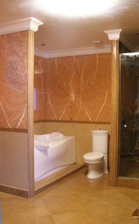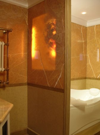 Глянцевые поверхности очень хороши в ванных комнатах. А так же для визуального расширения пространства, например, в коридоре. Для облицовки стен в таких случаях хорошо подходит оникс. На нем мне хочется подробней остановиться, потому, что красота оникса зависит не только от его цвета и узора, а еще и от степени прозрачности, что открывает большие возможности для украшения интерьера.