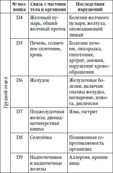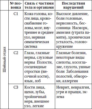 Он основа скелета, он придает телу нужную форму, к нему прикрепляются пласты больших и малых мускулов и связок спины и живота. Если же позвоночник искривляется, то это воздействует на кости всего скелета. Мускулы и связки укорачиваются, внутренние органы смещаются, что приводит к заболеванию всего организма. Спинной мозг может растягиваться, приспосабливаясь к меняющемуся положению тела, и повредить его трудно. Спинномозговые нервы состоят из миллионов отдельных нервных волокон, или нейронов. В зоне действия каждого спинномозгового нерва находится определенная часть тела, и можно точно соотнести нервы с различными частями тела. Нервы, выходящие из шейного отдела позвоночника, иннервируют в основном руки, плечи и голову. Нервы, выходящие из грудного отдела позвоночника, иннервируют с основном среднюю часть туловища. Нервы, выходящие из поясничной и крестцовой областей позвоночника, иннервируют в основном нижнюю часть туловища и ноги. Таблица Последствия нарушения иннервации спинномозговых сегментов
