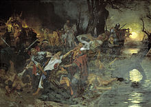 Генрик Семирадський. Воїни Святослава приносять полонених у жертву поганським богам під час облоги Доростола. 968 року починається перший балканський похід Святослава. У битві під Доростолом болгари зазнали поразки, руські війська оволоділи багатими придунайськими містами і захопили Східну Болгарію. Резиденцією руського князя стає місто Переяславець. Там, як він казав, «усі добра сходяться: із греків — паволоки, золото, вина й овочі різні, а з чехів і з угрів — срібло й коні, із Русі ж — хутро і віск, і мед, і невільники»[24]. Однак, 969 року, довідавшись про облогу Києва печенігами, Святослав змушений повернутися в Русь. Розбивши печенігів, він проводить деякі заходи щодо зміцнення управління державою: посадив на Київському столі старшого сина Ярополка, у Древлянській землі — Олега, в Новгороді — Володимира. Цим було покладено початок державній реформі, внаслідок якої Русь поступово ставала володінням однієї князівської династії. Сам Святослав 969 року повертається на Дунай і починається його другий Балканський похід. Та ситуація на Балканах змінилася не на користь Русі. Коли київський князь здобув низку перемог, Візантія різко змінила свою політику, і сам імператор Іоанн I Цимісхій пішов із величезним військом вибивати свого недавнього союзника з Болгарії. Почалася завзята боротьба у невигідній для русичів ситуації: відірваність від батьківщини, чуже населення, велика перевага військових сил противника та ін. Святослав боронив не тільки свої завоювання, але й честь руської землі. Літопис сповіщає, що він заохочував своїх воїнів до мужності в бою словами: «Так не посоромимо Землі Руської, ляжемо кістьми тут, і бо ж мертвий сорому не знає»[25]. У низці битв візантійців було розбито. Однак в останній, одній із найбільших,битві під Аркадіополем руське військо зазнало поразки. Після кількох місяців виснажливої боротьби знесилені сторони перейшли до переговорів і підписали договір, за яким війська Святослава дістали можливість почесно відійти у свою країну. Поряд із цим Русь відмовлялася від претензій на візантійські володіння в Криму та на Дунаї. Договір 971 року відновлював дію угод 907 та 944 рр., у результаті чого Русь повернулася до мирних і союзних відносин з Візантією. Під час повернення до Києва біля дніпрових порогів на розпорошені, ослаблені сили русичів напали печеніги, яких намовила Візантія, вбили Святослава та багатьох його дружинників. Святослав був визначним політичним діячем X ст., діяльність якого сприяла широкому виходу Русі на міжнародну політичну арену, служила фактором розширення, зміцнення і подальшого розвитку давньоруської держави. Однак, дбаючи про міжнародний авторитет Русі, її територіальне розширення, зміцнення економічних позицій на чорноморських ринках, руський князь не приділив достатньої уваги внутрішнім справам. Святослав, безумовно, був природженим полководцем, лицарем навіть у ставленні до ворогів і таким він увійшов в історію. Поряд із цим не можна ігнорувати і його помилок: погром і ослаблення Хазарського каганату завдало Русі шкоди, бо вона сама була неспроможна подолати кочовиків, які майже чотири століття панували у степах Причорномор'я. Балканська політика Святослава також нічого не дала Русі, а вимагала багато жертв. Частина його війн була відверто агресивною, загарбницькою, мала крива