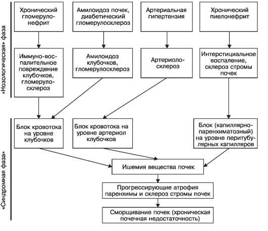 Нефросклероз - уплотнение и деформация (сморщивание) почек вследствие разрастания соединительной ткани. Этиология и классификация. Причины нефросклероза разнообразны. При гипертонической болезни и симптоматических гипертониях сосудистые изменения ведут к развитию артериолосклеротического нефросклероза (нефроцирроза) или первичного сморщивания почек (первично-сморщенные почки), при атеросклерозе возникает атеросклеротический нефросклероз (нефроцирроз). Склероз и сморщивание почек могут развиваться не только первично в связи со склерозом почечных сосудов, но и вторично на почве воспалительных и дистрофических изменений клубочков, канальцев и стромы - вторичное сморщивание почек, или вторично-сморщенные почки. Наиболее часто вторичное сморщивание почек представляет собой исход хронического гломерулонефрита (вторичное нефритическое сморщивание почек), реже - пиелонефрита (пиелонефритическое сморщивание почек или почки), амилоидного нефроза (амилоидное сморщивание почек, или амилоидно-сморщенные почки), почечнокаменной болезни, туберкулеза почек, диабетического гломерулосклероза, инфарктов почек и др. Нефросклероз (нефроцирроз) любой этиологии ведет к развитию хронической почечной недостаточности. Пато- и морфогенез. В пато- и морфогенезе нефросклероза можно выделить две фазы: первую - «нозологическую» и вторую - «синдромную». В первой фазе склероз почек обусловлен особенностями пато- и морфогенеза заболевания, при котором нефросклероз развивается. Во второй фазе патоморфологические и клинико-морфологические особенности нозологии сглаживаются, а иногда утрачиваются, ведущим становится синдром хронической почечной недостаточности. Нефросклероз в первой фазе, которая охватывает период до формирования блока почечного кровотока на одном из структурных уровней почки (артериолярном, гломерулярном, интерстициальном), является компонентом морфологических проявлений основного заболевания. Нозологическая специфичность его определяется преимущественным вовлечением в склеротический процесс одного из структурных элементов почки (артериолы, клубочки, интерстиций), а также качественными особенностями склеротических изменений почки (схема XXII). Во второй фазе нефросклероз связан с формированием блока почечного кровотока на уровне той или иной структуры (артериолярный, гломерулярный, капиллярно-паренхиматозный блок), который включает гипоксический фактор, определяющий дальнейшее прогрессирование нефросклероза (см. схему XXII). Склерозу подвергаются в равной мере все структурные элементы почки, в связи с чем морфологические признаки нозологии сглаживаются. Патологическая анатомия. При нефросклерозе почки плотные, поверхность их неровная, крупноили мелкобугристая; отмечается структурная перестройка почечной ткани. При установлении природы и вида нефросклероза имеют значение характер сморщивания (мелкозернистое - при гипертонической болезни и гломерулонефрите, крупнобугристое - при атеросклерозе, пиелонефрите, амилоидозе) и процесс, который явился основой нефросклероза. Схема XXII. Морфогенез нефросклероза