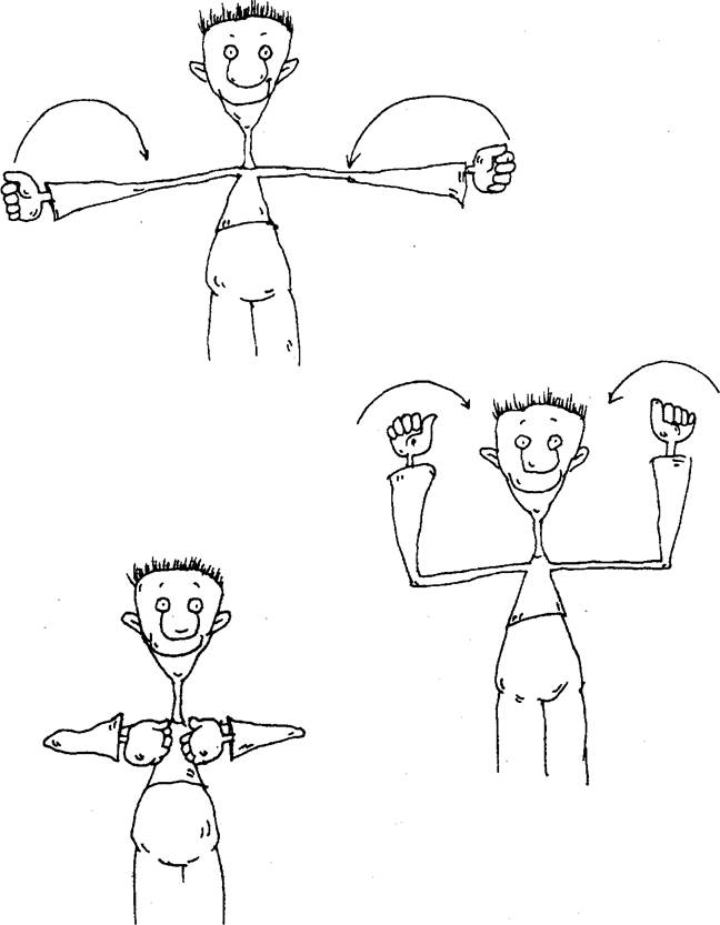 Мысленно надели корону на голову. Настрой! Добавьте какое-нибудь новое ощущение и усилием воли увеличьте его. Продолжаем. Плечевые суставы Упражнение № 8 Выпрямленную руку, свободно опущенную вдоль туловища, вращаем во фронтальной плоскости перед собой (в кисти появится ощущение тяжести и набухания, от приливающей крови она станет красной). Скорость вращения постепенно увеличиваем. Тренируем поочередно оба плечевых сустава. Каждую руку вращаем сначала по часовой стрелке, затем — против. Какое чувство внутри Вы вызываете? Упражнение № 9 Голова прямо. Плечи тянем вперед навстречу друг другу. Чувствуем приятное напряжение. Даем легкое расслабление и опять с новым усилием дополнительное напряжение, снова расслабление и т. д.