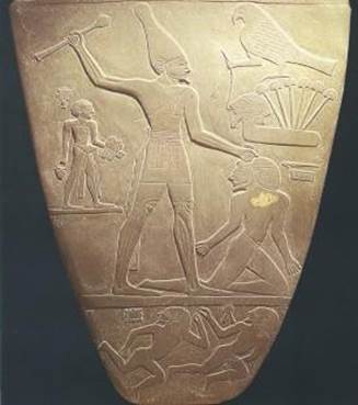 К первым проявлениям художественного творчества в виде росписи керамики следует добавить и рельефную резьбу по камню, украшавшую повседневные и ритуальные предметы;. Имеются в виду туалетные палетки, ножи, вотивные палицы и мемориальные стелы. По ним прослеживается постепенный переход от выразительных средств, унаследованных от палеолита, к новым достижениям в области формы. В итоге все большей систематизации пластических решений сложились строгие своды правил изображения, действовавшие в египетском искусстве на всем протяжении его существования. Туалетные или масляные палетки представляли собой прямоугольные пластинки из камня (шифера, известняка или алебастра) с круглым углублением в центре, служившим для растирания малахита, которым подводили глаза, или другой косметики. Эти палетки украшались рельефами фигуративных мотивов, покрывавших всю поверхность и представлявших людей и животных. Лев символически воплощает вождя, который своей мощью и хитростью побеждает соперничающий клан. Поверхность предмета и в данном случае сплошь покрыта фигурами, без соблюдения какого-либо строгого порядка. Ножи с рукоятями из слоновой кости были предметами церемониальной утвари. В Лувре хранится замечательный образец, найденный в Джебель-эль-Арак, со сценами, вырезанными на обеих сторонах рукояти. Он относится к более позднему времени, чем описанные выше палетки, и отражает важные изменения, произошедшие в способах изображения. На одной стороне этой рукояти представлена сцена сражения между группами людей, в котором участвуют корабли, на другой стороне — над рядом животных (львов и газелей) возвышается изображение человека, по бокам от которого помещены два льва. Фигуры стоящих людей составляют ряды по всей поверхности. Оборотная сторона палетки царя Нармера (шифер, высота 64 см), хранящейся в Египетском музее Каира. Это произведение, относящееся к эпохе I тинийской династии, то есть к начальной фазе существования объединенного Египта, и происходящее из Иераконполя, культового центра бога Гора, исполнено в технике низкого рельефа в соответствии с канонами упорядоченности, пропорций и символики, характерными для египетского искусства. На пороге истории искусство начинает утверждать идею престижа и власти царей. Так, создаются различные эмблемы царской власти, среди которых — вотивные палицы, украшенные рельефами. Одна из самых замечательных — палица царя Скорпиона (Оксфорд, Эшмолианский музей). На ней изображен царь с атрибутами, свидетельствующими о его ранге, — короной Верхнего Египта и собачьим хвостом, — держащий в руках мотыгу, во время ритуального сева. Фигура царя господствует над прочими благодаря своим размерам, надписи с именем царя Скорпиона и штандарту с изображением Гора в образе сокола, указывающему, что перед нами сын бога. Новое, что можно увидеть на этой палице, — имя царя, впервые выгравированное иероглифами, чтобы засвидетельствовать для потомков верховенство конкретного вождя.