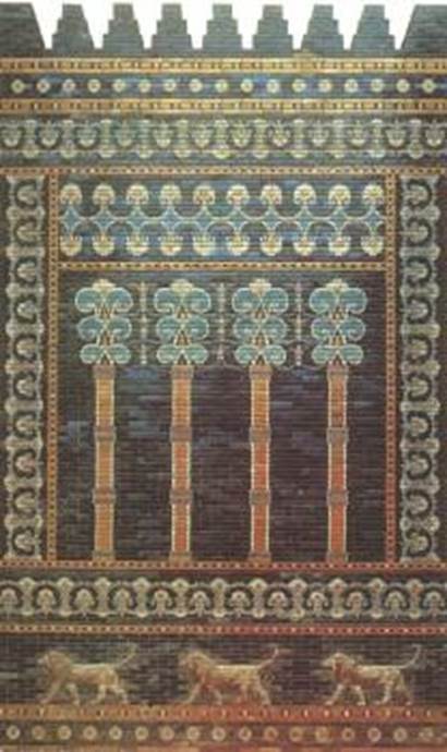 Техника эмалированного кирпича, внедренная касситами, получила огромное распространение, так как при ней в декорации достигался большой визуальный-эффект. Структура кирпичей делала возможным строительство гигантских стен, — техника, осуществлявшаяся нововави-лонянами, а также ахеменидами. Ассирийцы применяли ее к цоколям храмов, а также для покрытия стен дворцовых залов. От храма Набу, от дворца Хорса-бада сохранился фриз с изолированными зооморфными фигурами и священными эмблемами. В нововавилонский период эмалированные кирпичи обрели важное значение, поскольку украшали улицы и главные ворота. Часть внешней декорации одного из трех портиков, которые вели в тронный зал царского дворца Вавилонии, хранящаяся в Пергамонском музее в Берлине. На синем фоне цоколь изображает парад львов (VI столетие до н.э.), над которыми выделяются колонны, поддерживающие различные капители. Весь ансамбль обрамлен бордюрами с растительными мотивами. В Вавилонии по обе стороны проспекта Процессий высилась стена, покрытая эмалированными кирпичами с лепными изображениями рычащих львов на синем фоне. В целом насчитывалось 120 фигур по 2 м каждая. Уместно поэтому предположить, что они должны были производить большой эффект на зрителей. Ворота Иштар, откуда начинается этот длинный церемониальный проспект, была полностью покрыта белыми фигурами быков и драконов на синем фоне. В Тронном зале дворца Навуходоносора стена покрыта великолепно стилизованными кирпичами и имеет колонны с завитками, входящими во фризы с цветочными мотивами. В самой нижней части имеется фриз со львами. Синий фон контрастирует с голубыми и коричневыми деталями.