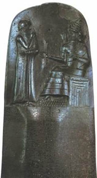 В вавилонскую эпоху традиция стел получила продолжение в качестве панно для написания законов, среди которых единственным полностью уцелевшим экземпляром является «Кодекс Хаммурапи» (Париж, Лувр) на черном диорите. Он достигает 2 м в высоту и содержит 282 закона, записанных сериями по 20 колонок. В верхней части имеется рельефное изображение царя Хаммурапи, представшего перед богом Солнца Шамашем, который, восседая на троне и окруженный пламенем, присваивает ему символы справедливости и власти. Царь, одетый в простую тунику, оставляющую одно плечо обнаженным, внимает богу с поднятой рукой в знак почтения. Обе фигуры смотрят друг другу прямо в глаза в позе полного взаимопроникновения. Эта сцена напоминает стих из Библии, в котором Яхве передает Моисею таблички с божественным законом на горе Синай. Фрагмент «Кодекса Хаммурапи- (базальт, высота 2,25 м), который хранится в Лувре. Он был обнаружен в эламнтских Сузах, куда был отвезен, вероятно, в качестве военной добычи. Этот знаменитый и важный аккадский законодательный документ XVIII столетия до н.э. содержит 282 высеченных закона. Над ними, в сцене подлинного величия изображается фигура царя, стоящего в почтенной позе перед богом справедливости. Бог, восседающий на троне, с языками пламени, вырывающимися из его плеч, диктует царю закон. Гора несет на себе важную смысловую нагрузку, которая воплощается также в округлом контуре стелы. Стела придает данному акту божественный характер и превращает законы в наследие богов, подкрепляя тем самым власть и авторитет царя. В новошумерскую эпоху интерес к рельефу сконцентрировался на воплощении поклонения богам и, хотя стелы в память о баталиях, должно быть, также существовали, остатков их обнаружено не было. От царя Ур-Нам-му, который сумел изгнать гутиев и консолидировать объединенную монархию в III династии Ура, до нас дошла стела, изображающая этого монарха во время работы на строительстве храма для богов. Она представляет собой плиту с пятью следующими одна над другой картинами с обеих сторон. На первых царь преподносит богам жертвенное возлияние, на нижних — несет инструменты в качестве первого из строителей. Оборотная сторона посвящена музыкальным сценам и сценам жертвоприношений.