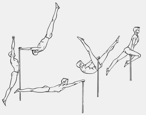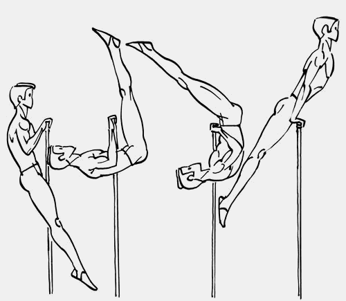 Рис. 9 Из упора сзади соскок махом вперед. Из упора сзади слегка отвести ноги назад; затем сделать мах вперед и, оттолкнувшись руками, прогнуться и выполнить соскок (рис. 10). Подводящее упражнение: соскок из упора сзади на низкой перекладине. Помощь и страховка: при соскоке стоять сбоку, предупреждая падение вперед или назад. Комплексное атлетическое упражнение. Выполняется из виса на прямых руках хватом сверху в строгой последовательности: подтягивание на перекладине, поднимание прямых ног к перекладине, подъем переворотом на перекладине. Засчитывается количество полных циклов. Положение в висе и упоре фиксируется на прямых руках 1-2 с. Date: 2015-08-06; view: 3098; Нарушение авторских прав |