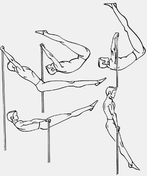 Рис. 7 Оборот назад в упоре. Вис, подъем переворотом; из упора мах назад; махом вперед, касаясь бедрами перекладины и слегка сгибаясь в тазобедренных суставах, начать вращение назад; завершая оборот, разогнуться в тазобедренных суставах и выйти в упор. Подводящие упражнения: а) из упора махом назад соскок, держась руками за гриф (на низкой перекладине); б) мах назад и опускание в упор, слегка сгибаясь в тазобедренных суставах (на низкой перекладине); в) оборот назад на низкой перекладине.
