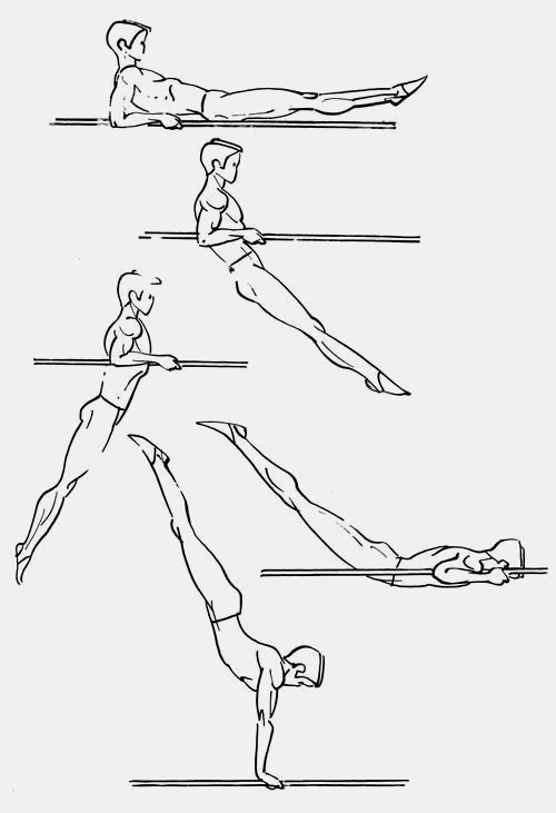 Рис. 10 Подъем махом вперед. В крайней точке маха назад (когда ноги и таз поднимутся выше жердей) незначительно согнуться в тазобедренных суставах. По ходу маха вперед вначале прогнуться, а затем - несколько раньше, чем тело подойдет к вертикали, - сделать энергичное движение ногами вперед, сгибаясь в тазобедренных суставах (до 135°). До того как ноги достигнут уровня жердей, резко разогнуться, притормаживая движение ногами. Вслед за этим сделать энергичный рывок грудью и, отталкиваясь плечами от жердей и опираясь на них руками, перейти в упор (рис. 11). Подводящие упражнения: а) из упора на предплечьях (на наклонных жердях) махом вперед сед ноги врозь; б) то же в упор. Помощь и страховка: помочь обучаемому выполнить подъем нажимом вверх под пах и плечи (руки снизу жердей). Подъем махом назад. Из упора согнувшись, разгибая тело вперед и вверх, подтянуть плечи к кистям; пройдя вертикальное положение, усилить мах ногами назад и, не доходя до крайней точки, энергично вьпрямить руки; подать плечи вперед и выйти в упор на прямые руки (рис. 12).