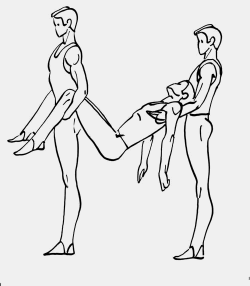 Существуют следующие способы переноски одного двумя: 1. Переноска сидящего на руках (рис. 26). 2. Переноска с поддержкой под руки и колени (рис. 27). 3. Переноска сидящего на сцепленных руках. Переносящие встают друг против друга; каждый одной рукой берет себя за запястье другой руки хватом сверху, свободной же кистью - за свободное запястье руки партнера; захваты должны быть одноименными (рис. 28). Переносимый садится на сцепленные руки и держится за плечи переносящих. 4. Переноска с поддержкой под ноги и спину (рис. 29).