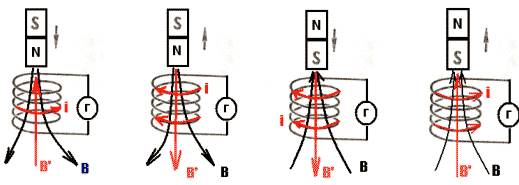 Рис. 5 Вывод: направление тока зависит от направления магнитного поля. Опыт: вносим магнит сначала медленно, затем быстро. Вывод: величина тока зависит от скорости внесения магнита. Учитель: Для определения направления индукционного тока в замкнутом контуре используется правило Ленца: Индукционный ток имеет такое направление, что созданный им магнитный поток через поверхность, ограниченную контуром, препятствует изменению магнитного потока, вызвавшего этот ток. Применим данное правило для следующих случаев: (рис. 6)