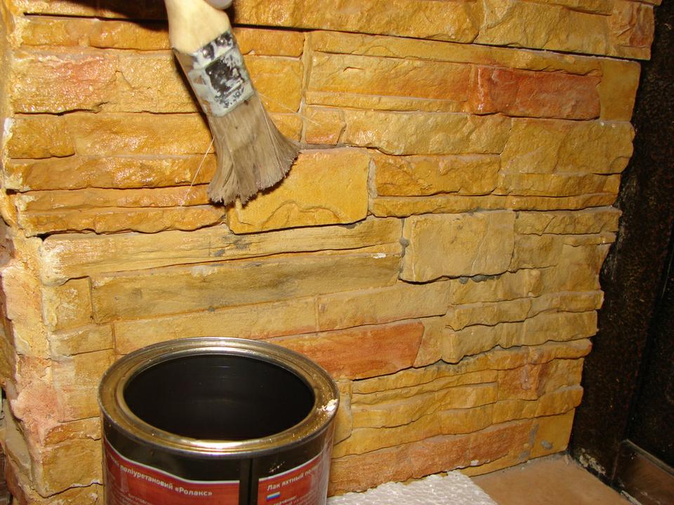 Обрабатываем окрашенную поверхность грунтовкой. Так мы запечатаем поры гипса для предотвращения истирания краски. После того как грунтовка засохнет, можно обработать поверхность лаком для камня. Лак достаточно быстро подсыхает, но очень долго выветривается. Порой его запах не исчезает в течение 5 дней, однако эффект того стоит. Поверхность заблестит матовым блеском, как настоящий камень.