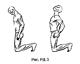 — Ритуальное действие третье должно выполняться сразу же вслед за первыми двумя. И так же, как первое и второе, оно является очень простым. Исходным положением для него служит положение стоя на коленях. Колени следует ставить на расстоянии ширины таза одно от другого, чтобы бедра располагались строго вертикально. Кисти рук ладонями лежат на задней поверхности мышц бедер как раз под ягодицами. — Затем следует наклонить голову вперед, прижав подбородок к грудине. Забрасывая голову назад вверх, выпячиваем грудную клетку и прогибаем позвоночник назад, немного опираясь руками о бедра, после чего возвращаемся в исходное положение с прижатым к грудине подбородком. Немного отдохнув, если необходимо, повторяем все сначала. Таковы движения третьего ритуального действия «Ока возрождения» (Рис. РД – 3).