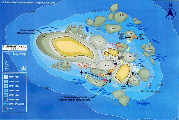 Элефант Хэд Рок (Elephant Head Rock), расположен в 1,5 км к югу от острова Ко Симилан (№8 - Koh Similan) и представляет собой три огромных валуна, выступающих над поверхностью. Надводная часть имеет форму головы слона. Элефант Рок – невороятной красоты «подводный небоскреб», стоящий в открытом море в очень чистой воде. Подводные валуны на Элефант Хэд Рок сложены так, что образуют отвесные стены и тоннели, покрытые мягкими кораллами и «морскими веерами» разных оттенков. Максимальная глубина на этом дайв-сайте составлет 35-40 метров. Элефант Хэд Рок не рекомендуется для занятий снорклингом – из-за большой глубины (основание скалы находится на глубине 40 метров) там сложно что-либо рассмотреть с поверхности. Одной из особенностей Элефант Хэд Рок является обилие подводных тоннелей, стены которых покрыты мягкими кораллами – погружаться здесь из-за сложности маршрута можно только высококвалифицированным дайверам. Течение: от умеренного до сильного. Во время прилива движется с юго-запада на северо-восток, а во время отлива наоборот. Укрыться от сильного течения можно с северной стороны от валунов, однако нужно быть предельно осторожным, так как направление течения рядом с валунами часто меняется. Во время отлива течение движется с северо-востока на юго-запад. Морская флора и фауна На внешней стороне от валунов часто встречаются чёрнопёрые рифовые акулы, а в расщелинах между валунами - белопёрые рифовые акулы. В средних слоях воды рядом с валунами водятся стаи синепёрых и гиганских каранксов, стрельцов, радужных макрелей и барракуды. А в трещинах и углублениях можно заметить большого снэппера и сладкогуба. В глубоких местах можно найти фиолетовую огненную рыбу-стрелку, а возле скал каменного губана, рыбу-клоуна и морскую собачку. Также в некоторых трещинах валунов живут креветки-боксёры, креветки-доктора и осьминоги. Дайв - сайт: Donald Duck Bay (также известный как Ao Guerk)