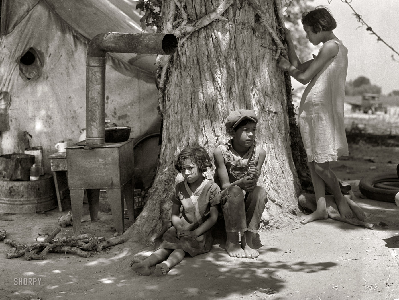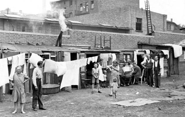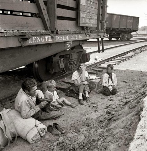 Семья бедняка, США, 30-е Десятки миллионов разорившихся отчаявшихся людей бежали в другие районы, где им казалось, что выжить проще. Так была заселена Калифорния, имевшая до этого весьма низкую плотность населения. Кому повезло жили в лачугах и благотворительных ночлежка, кому меньше - в палатках, кому нет - на улице. Дети мерли как мухи. Тысячи 13-14 летних детей, у которых родители умерли от голода и болезней или более не могли их содержать, годами ездили по стране на крышах товарных вагонов, перебиваясь случайной работой, попрошайничая, воруя, погибая и пропадая без вести.
